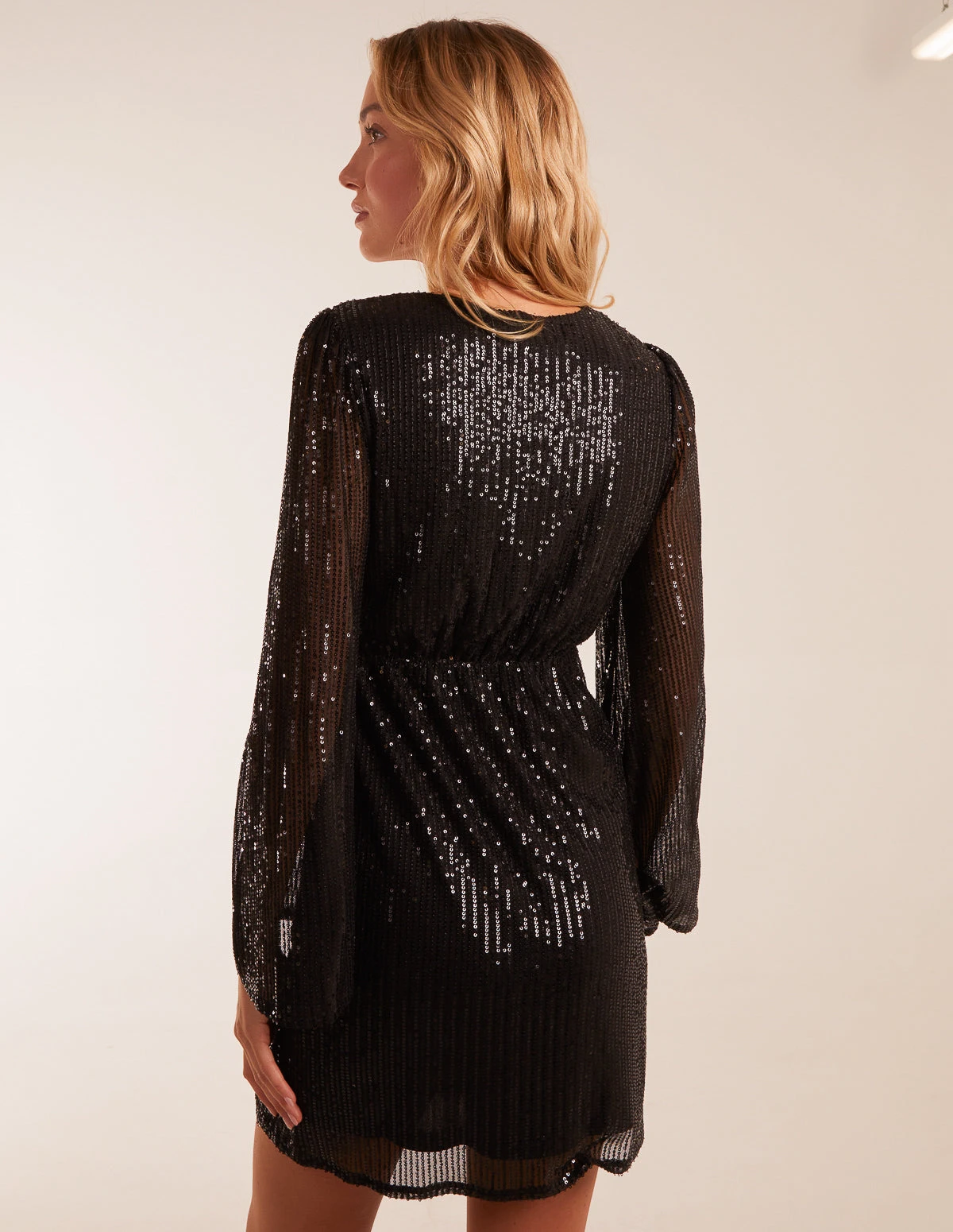 It’s party time with our Angel Sleeve Sequin Mini Dress. This head-turning dress features a sequin design, a v-neckline, long sleeves to help you stay warm and a bodycon shape to perfectly contour your figure. Style with block heel boots and tights.