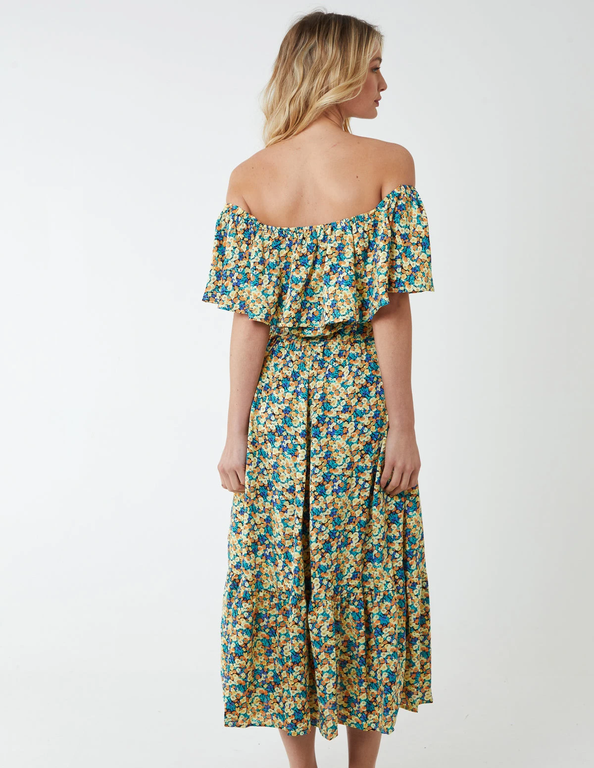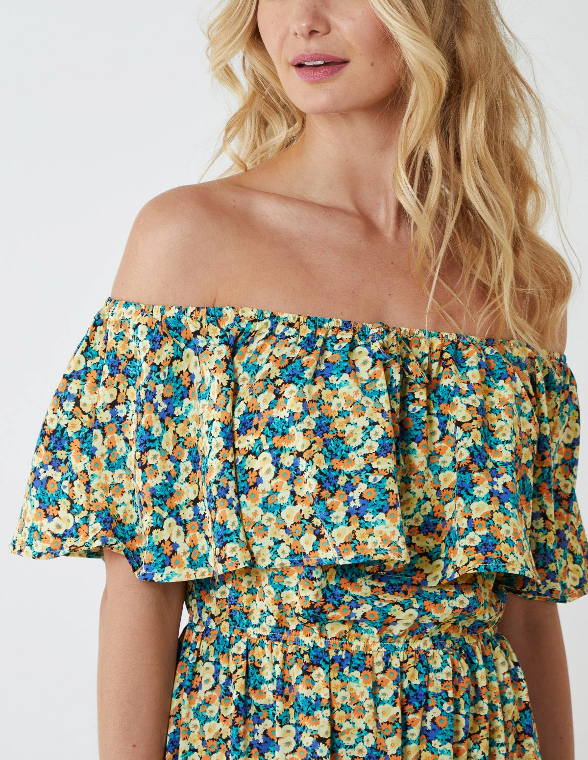 This bardot ruffle shoulder dress is perfect for casual weekends or your next summer holiday destination. It features shirred waist and a tie front detail. The sleeves can be worn off shoulder or over the shoulders for a more modest look.