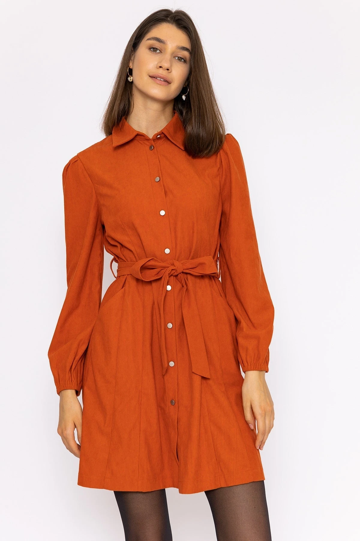 Shirt style mini dress in rust by Rowen Avenue. Perfect for any occasion!