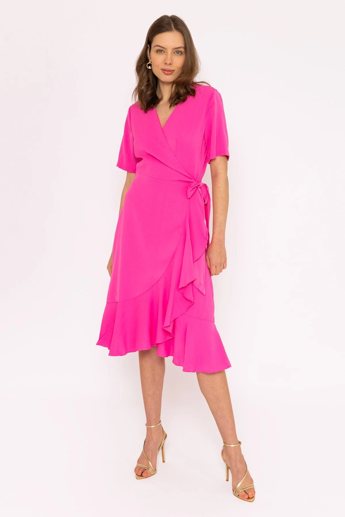 Short sleeved midi wrap dress in fuchsia by Rowen Avenue.