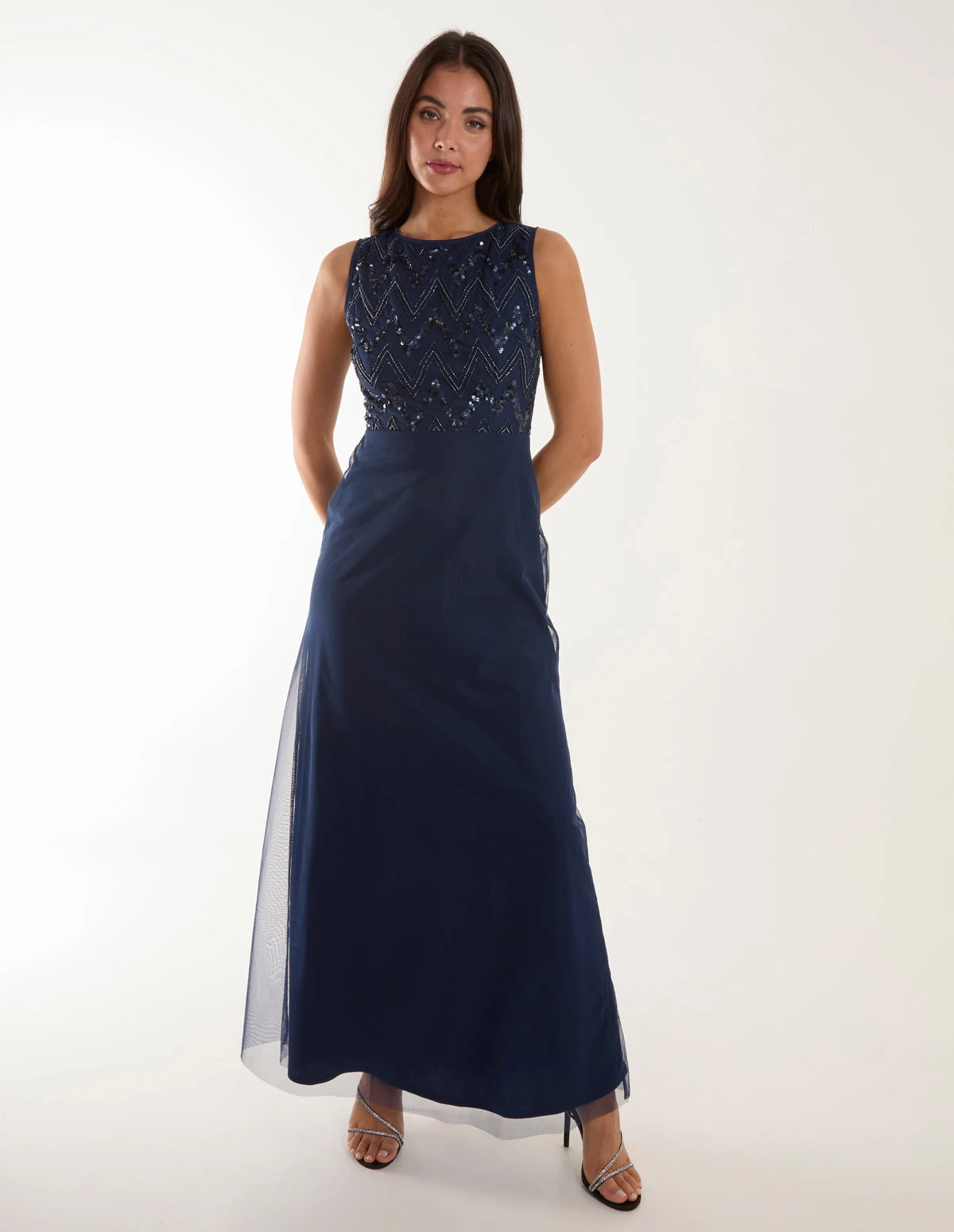 A bold take on Blue Vanilla, this ankle-hitting maxi dress comes detailed with chunky diamond-and-bead embellishments at the neckline. With its pleated front and classic column silhouette, it ticks all the right boxes for sultry summer soirees, draping down to a hem for a daring finishing.