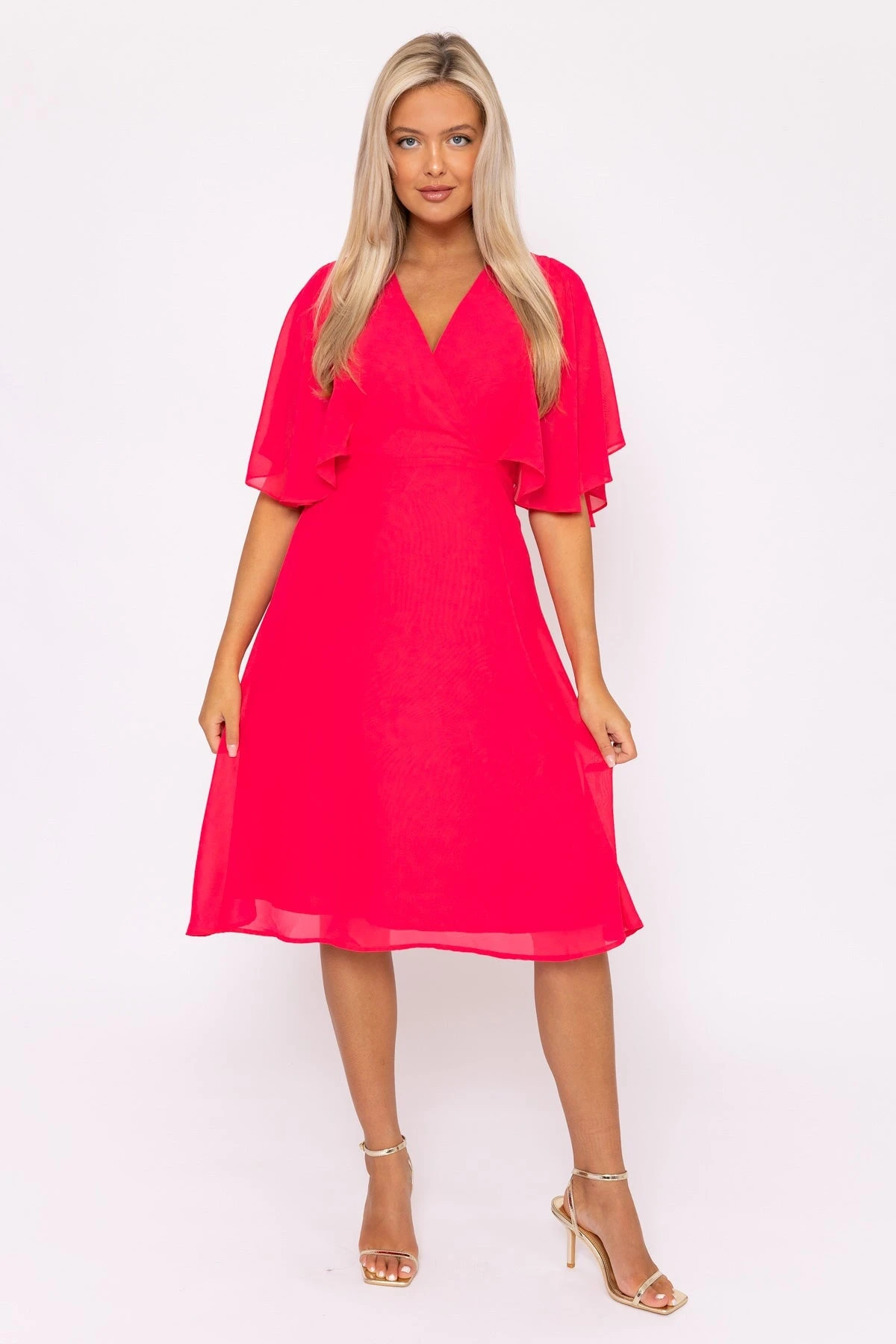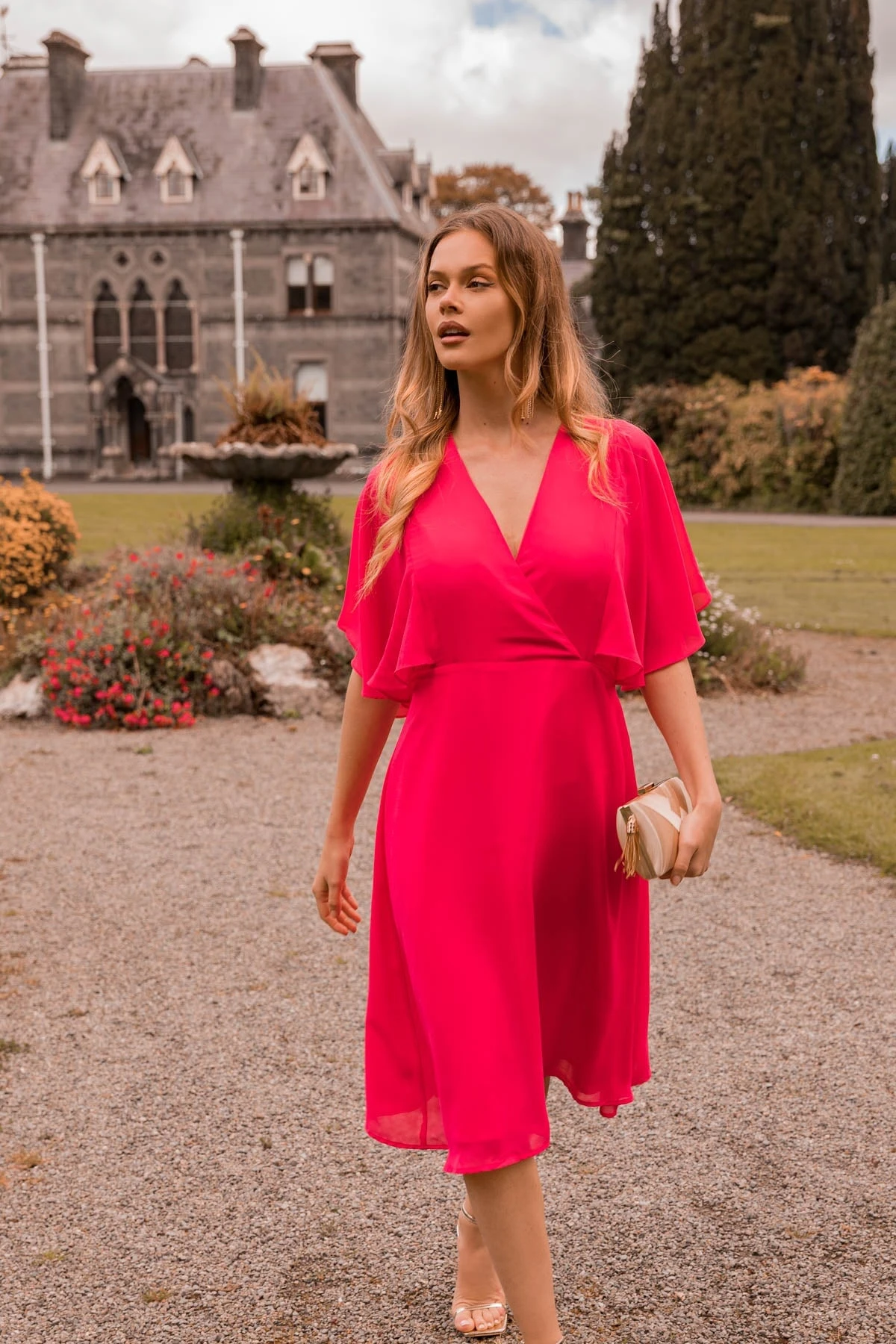 Fuchsia knee length dress by Rowen Avenue. A perfect occasion wear dress with an angel sleeve.