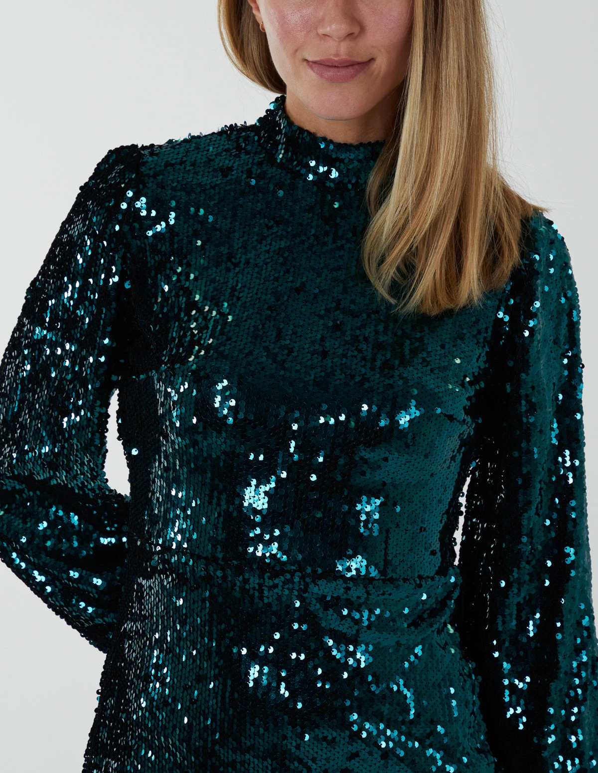 It’s party time with our High Neck Balloon Sleeve Bodycon Dress. This head-turning dress features a sequin design, a high neckline and long sleeves to help you stay warm, and a bodycon shape to perfectly contour your figure. Style with block heel boots and tights.