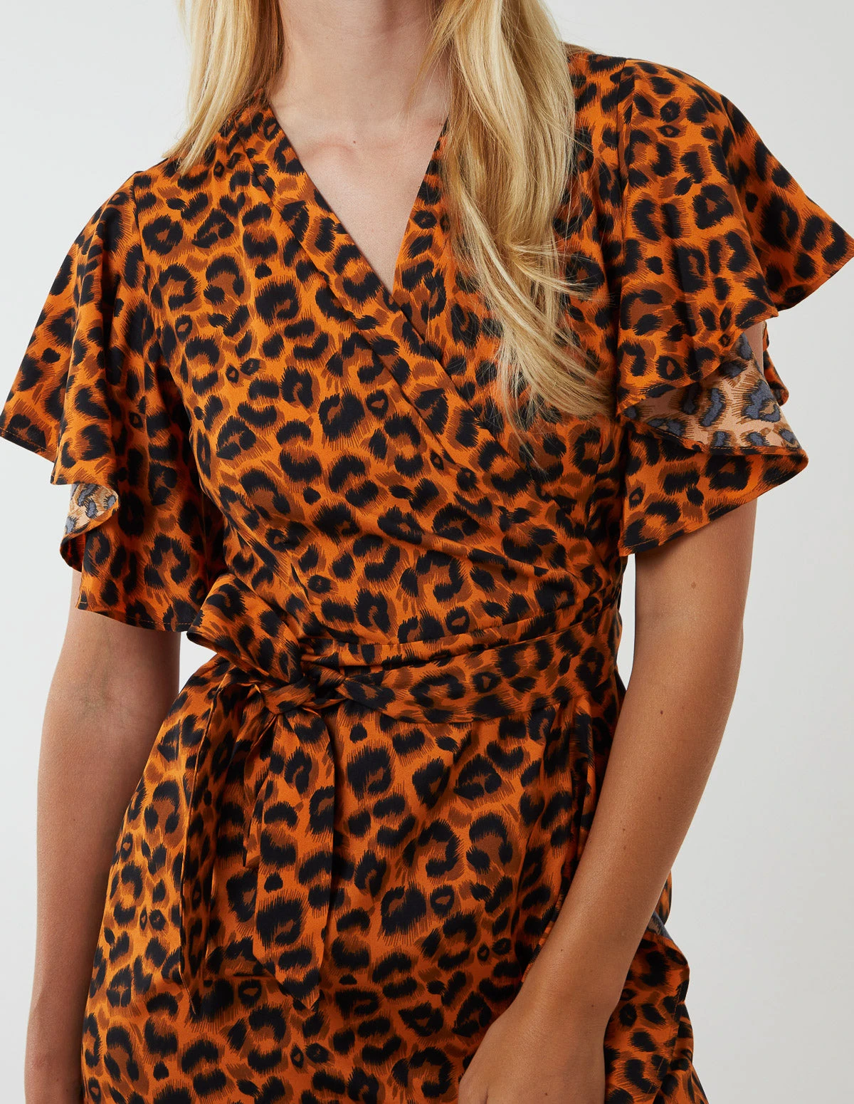 Make a statement this season with this leopard print dress! With a wrap front, tie waist and frill sleeves that add a refined element to the dress, complete your look by matching with wedge shoes.