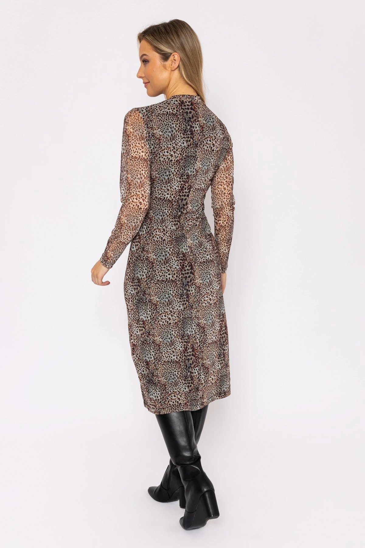 Long sleeve midi dress in animal print by Rowen Avenue. Perfect for any occasion, this dress is as comfortable as it is stylish. Look good and feel confident to take on the day!