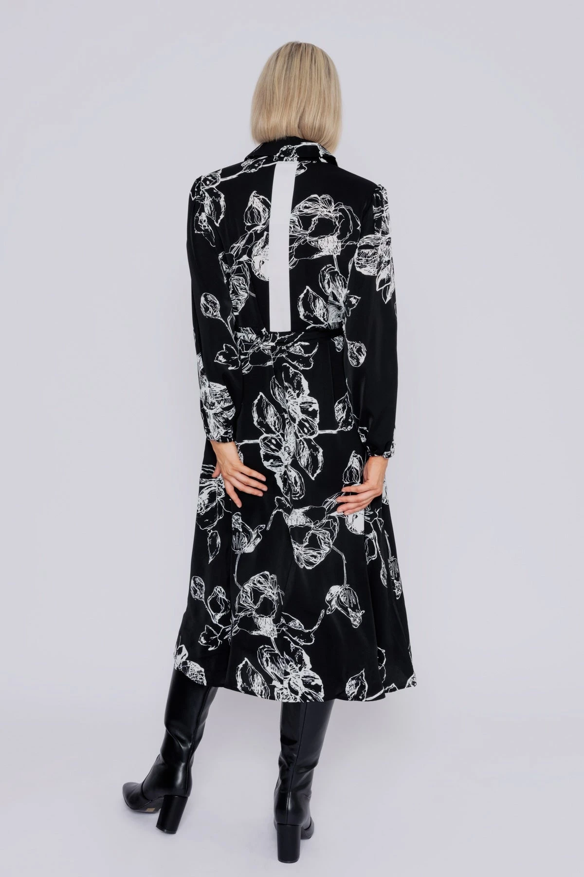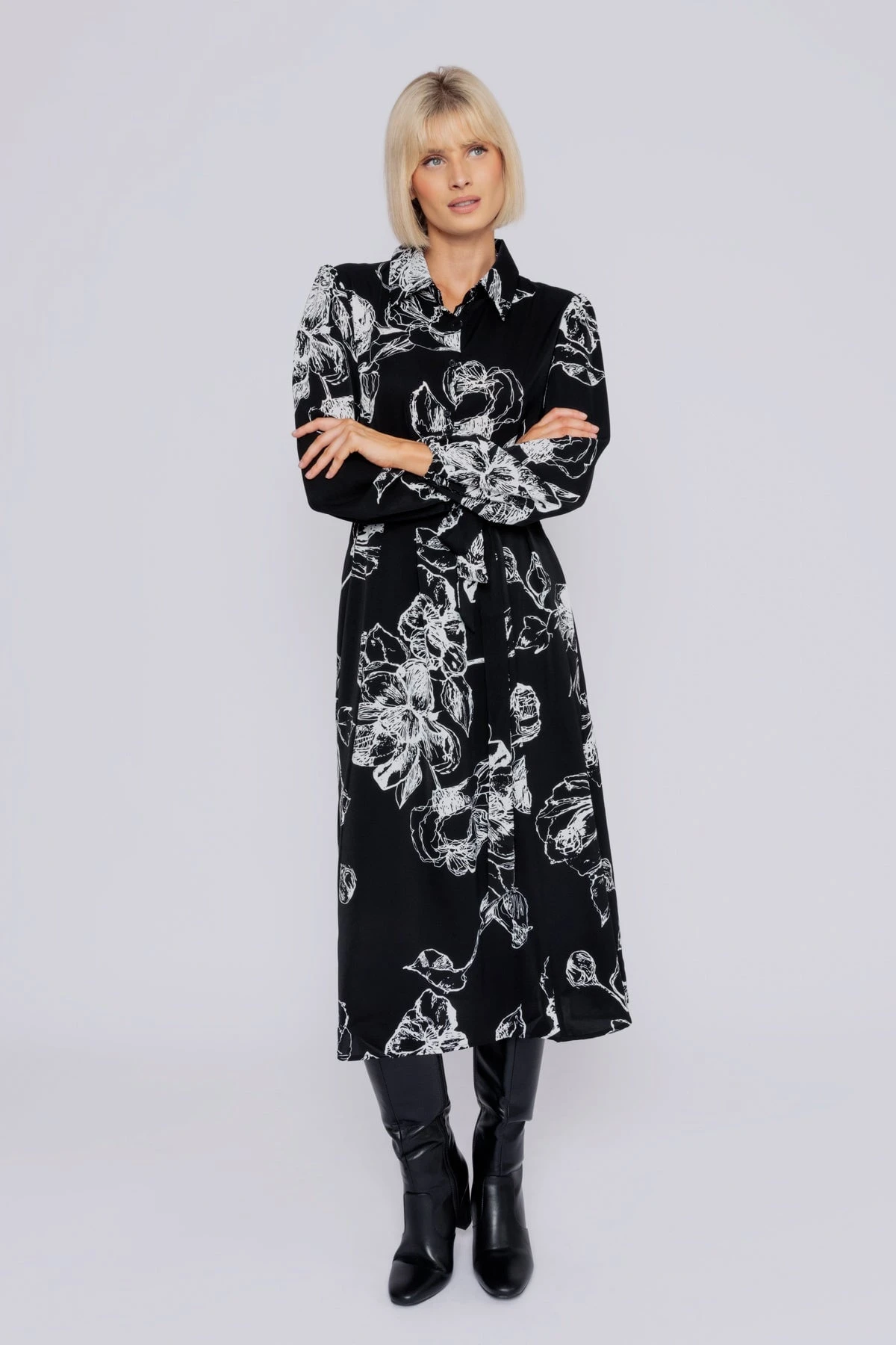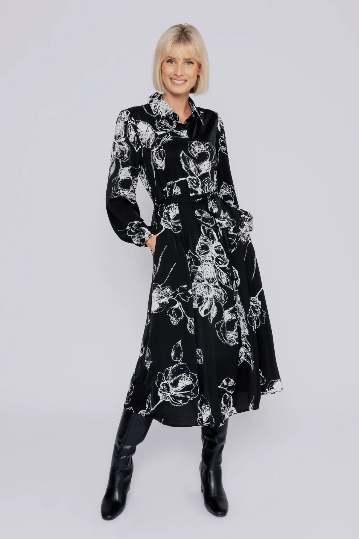 Long sleeve shirt dress in black and white print by Rowen Avenue. Look stylish and stay comfortable in this midi dress. Featuring a button placket, belt, and beautiful monochrome print, this dress is perfect for any occasion. Enjoy the flattering fit and modern design of this timeless piece!