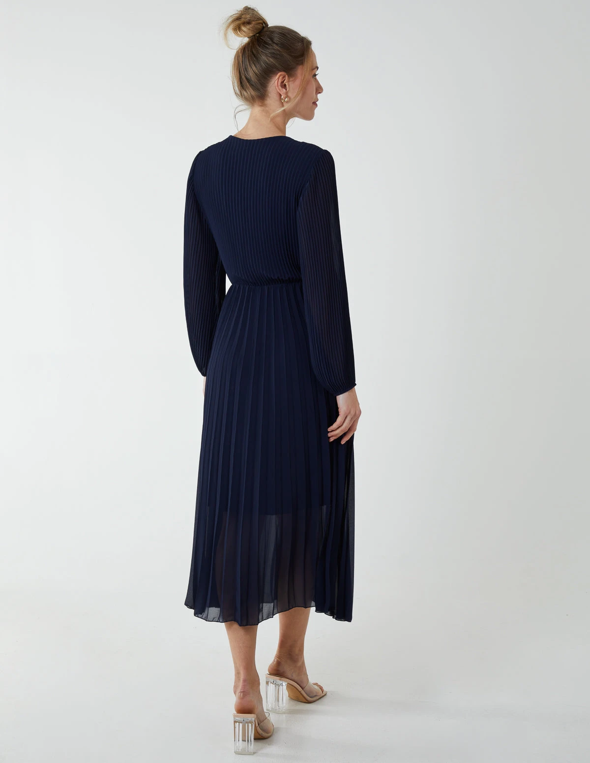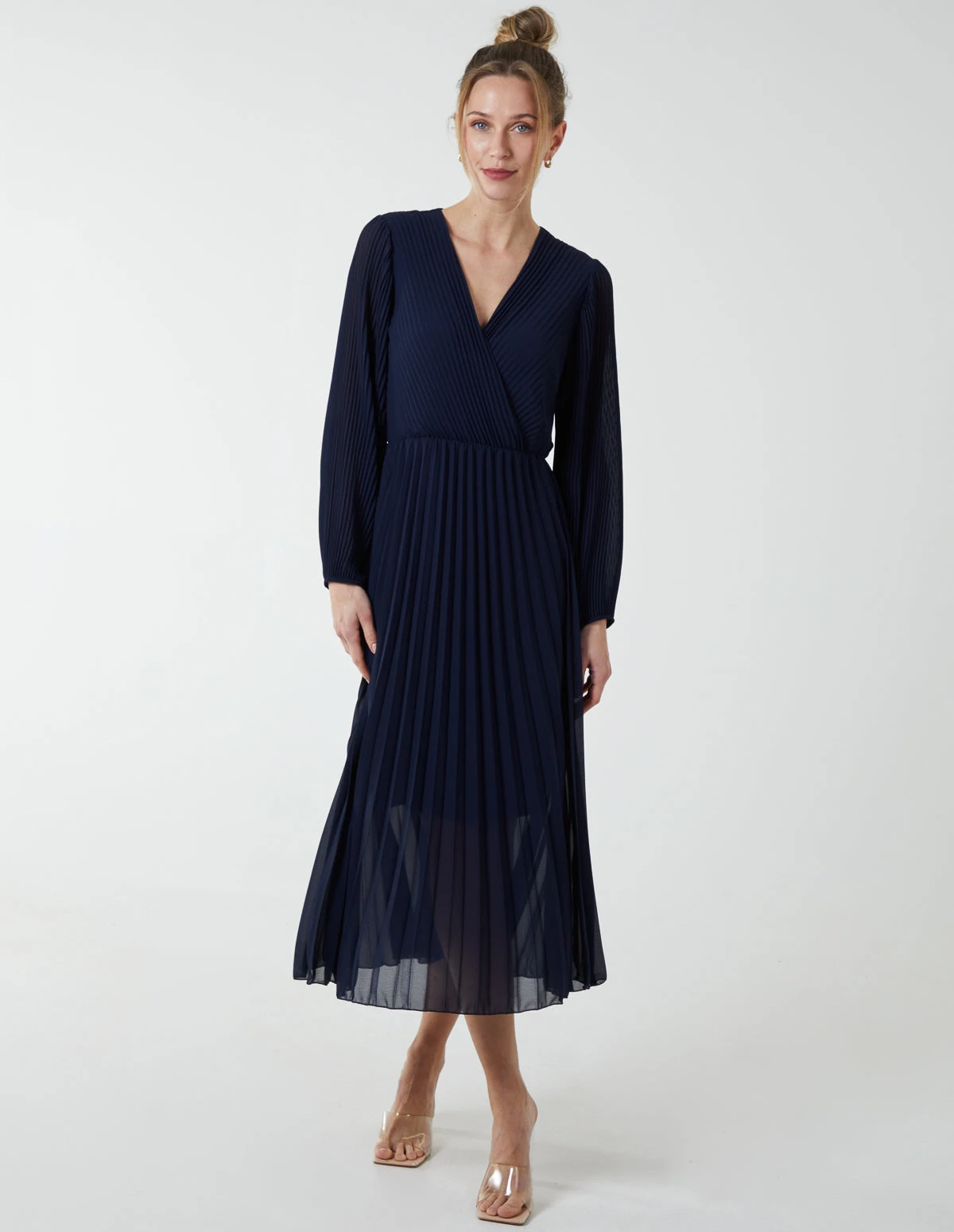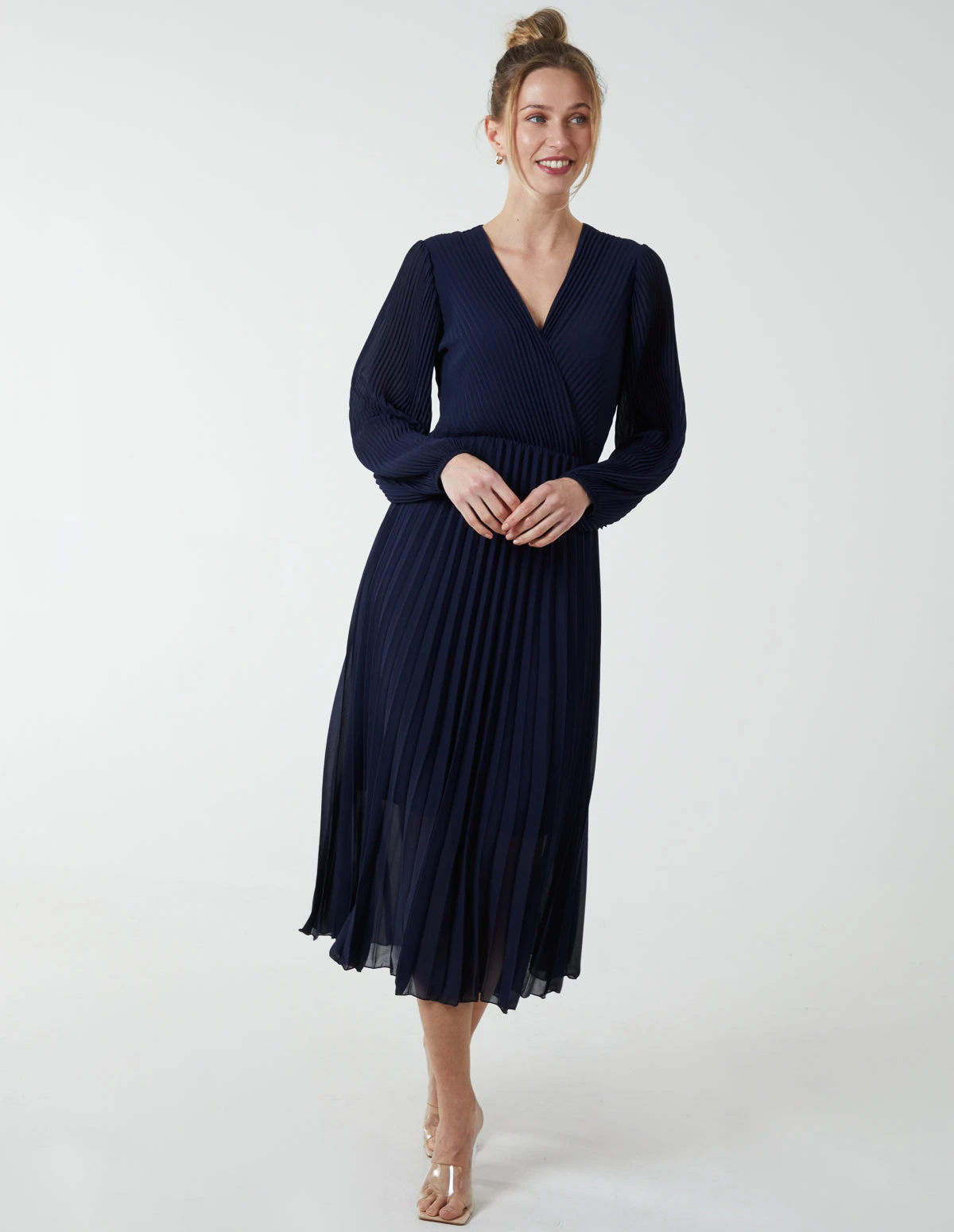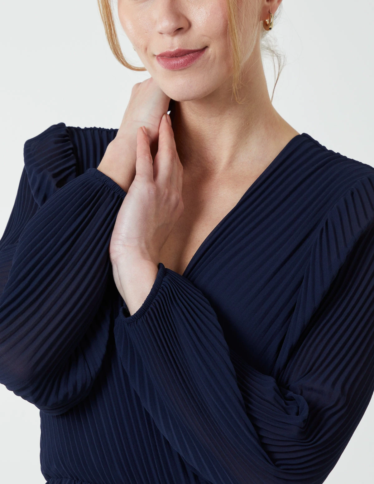 A pretty option for SS days, this pleated v-neck dress is an elegant style for warmer days ahead.