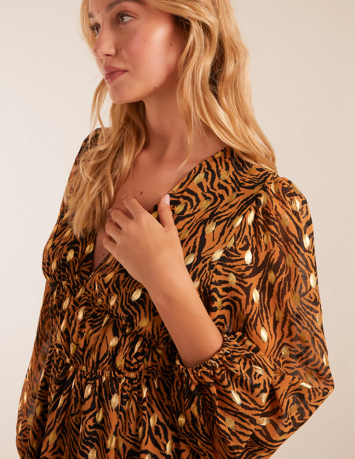 Shirred Waist Leopard Foil Wrap Front Mini Dress