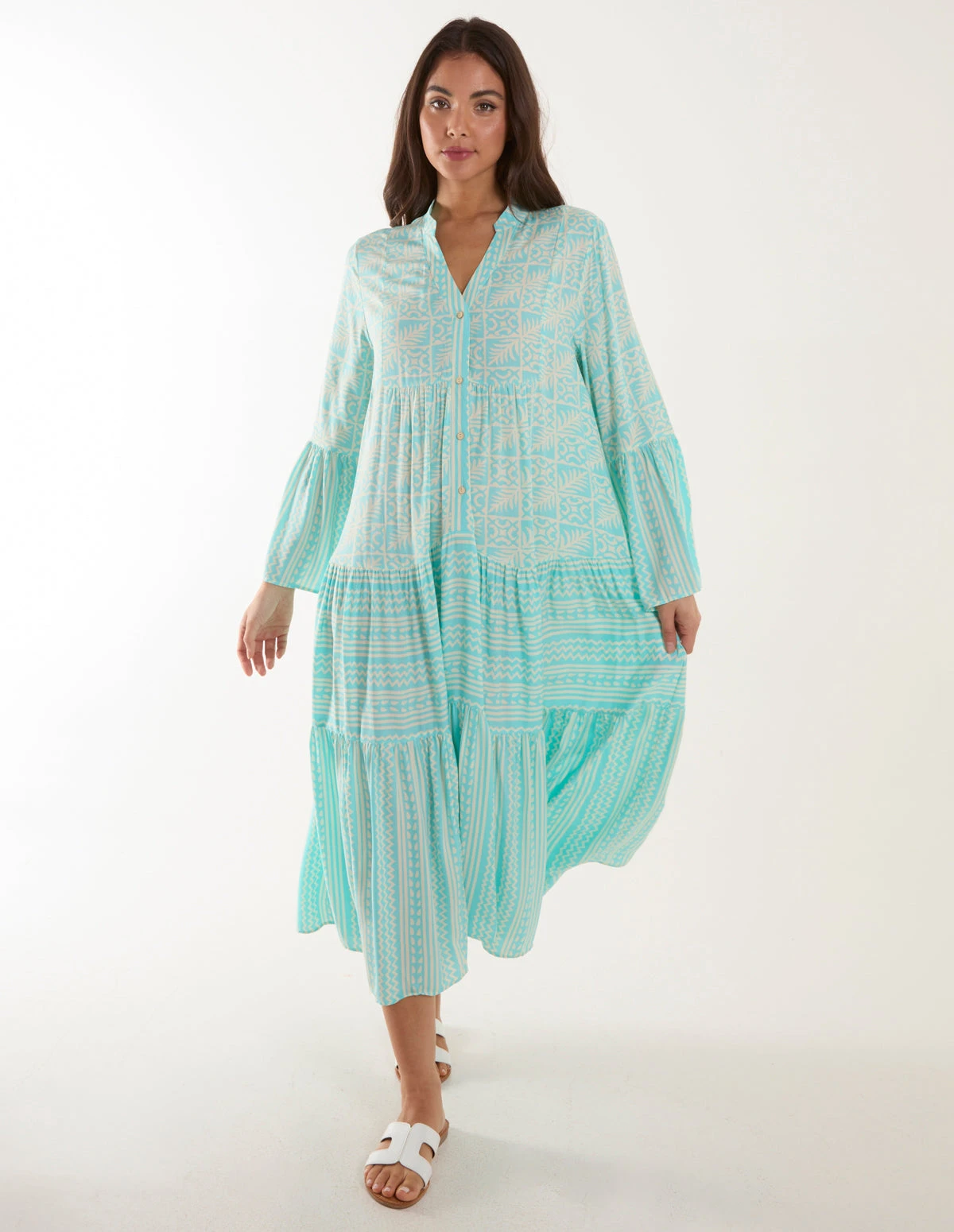 Stand out from the crowd this summer, by wearing this Aztec print maxi dress! A maxi that gives full-on vibes and a perfect breezy option for those warmer Summer days!
