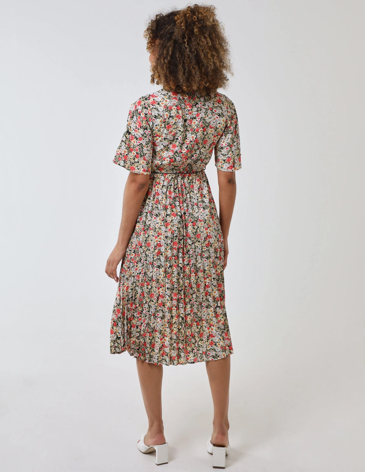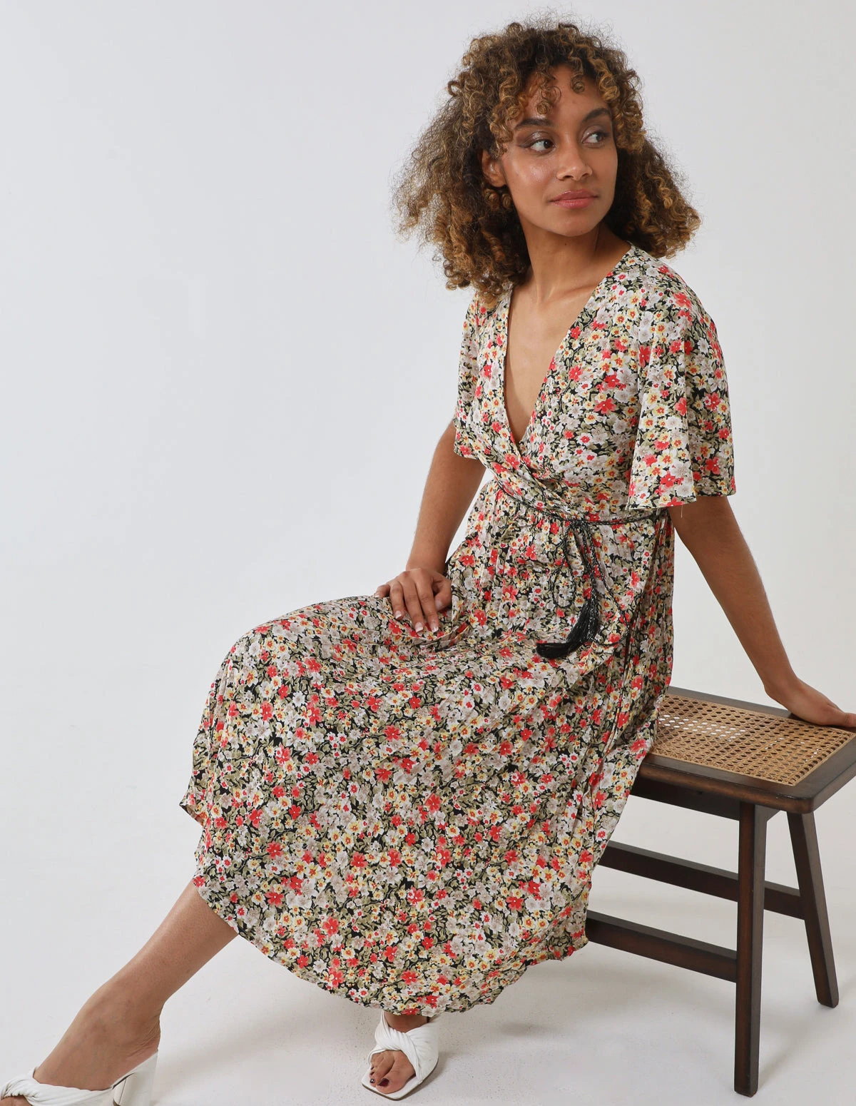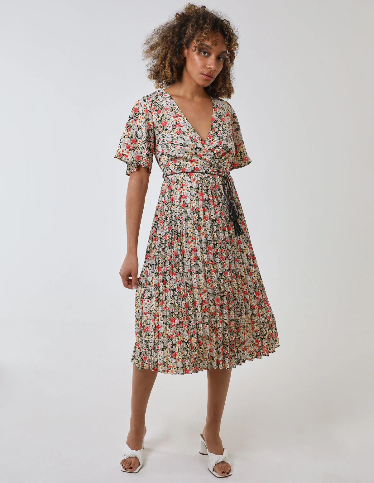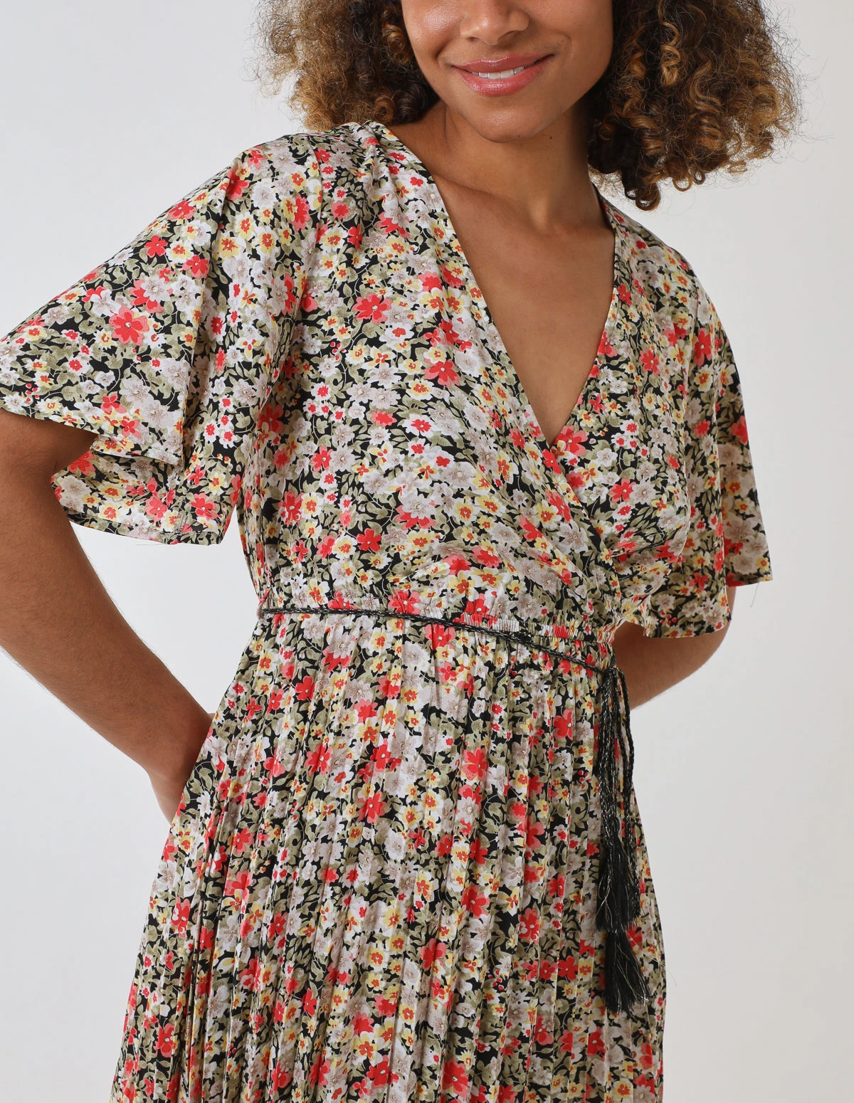 Wrap Front Pleated Hem Dress With Angel Sleeves
