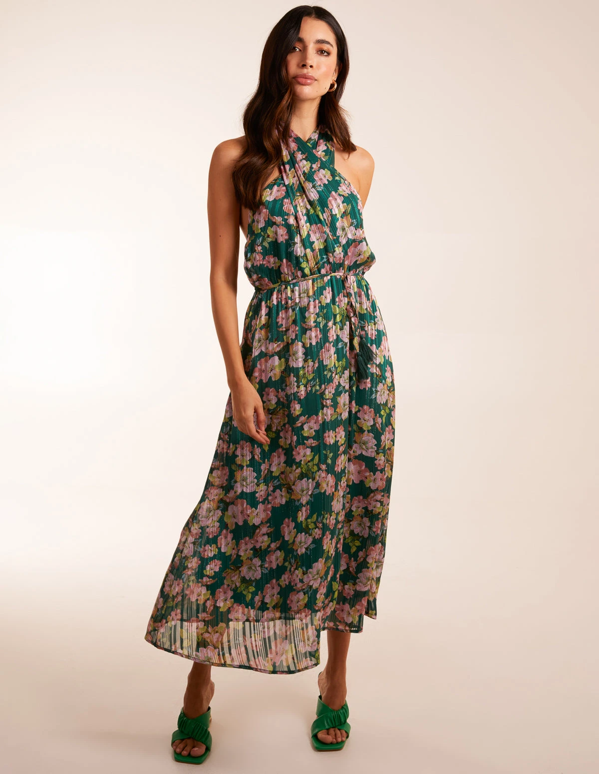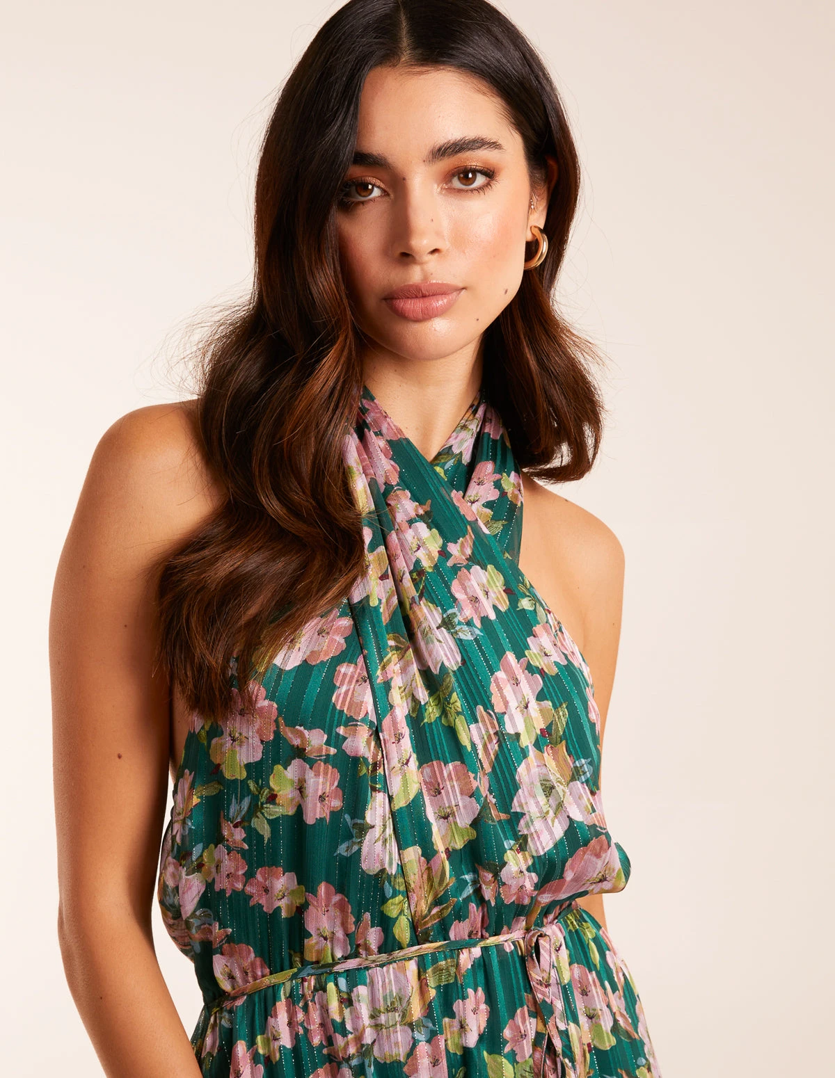 For women who love floaty styles choose this shoulder-baring pleated halter neck dress is this dress for you. Team with gold wedges and clutch bag.